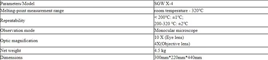 WX-4 is used to determine the melting point of a substance. It is mainly used for the determination of crystalline organic compounds such as pharmaceuticals, chemicals, textiles, fuels and perfumes. The instrument is microscopically observed and can be measured either by capillary method or by slide-cover slide method (hot table method).
